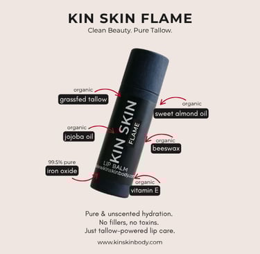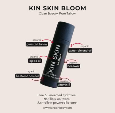 Kin Skin is my solution: clean, nutrient-rich lip care crafted from grass-fed tallow, organic beeswax, and botanicals. No chemicals, no fillers, no toxins, just the kind of balm I wish I had on every trail, now made for you.